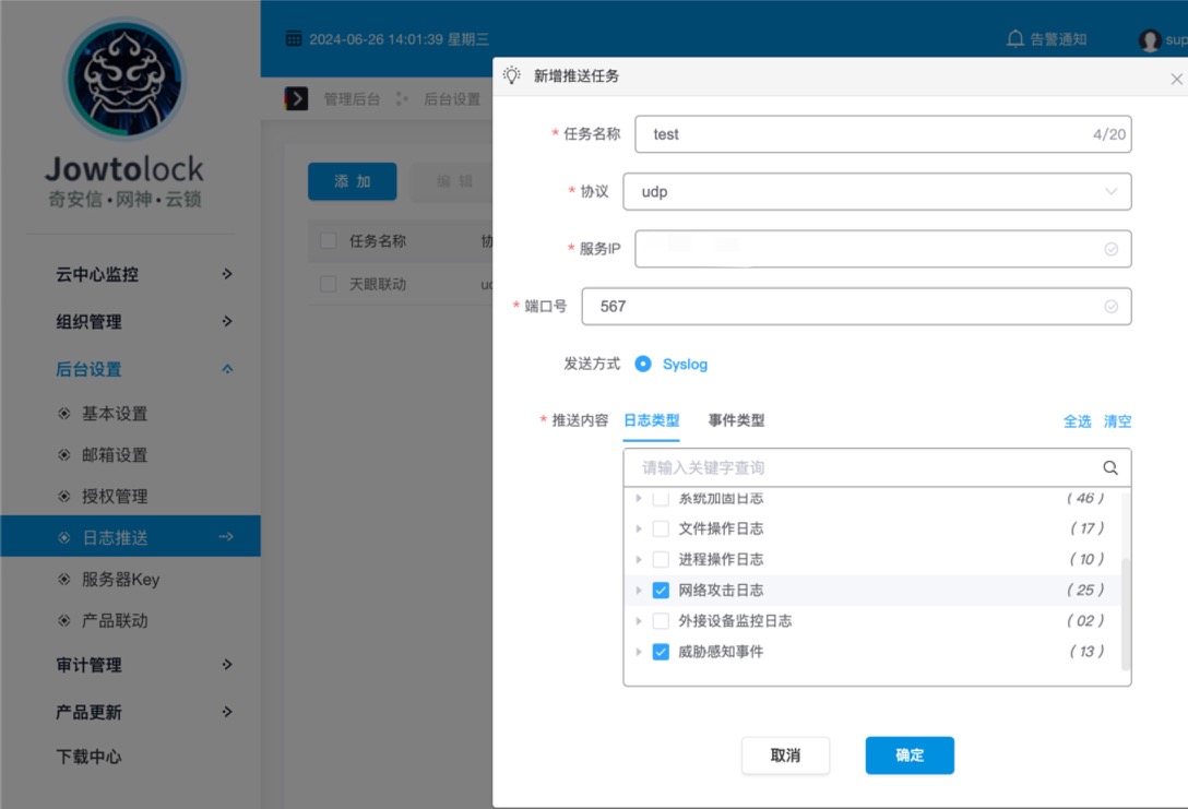 椒图外发syslog需要登录superadmin账号,登录后通过后台设置-日志推送,添加推送任务。