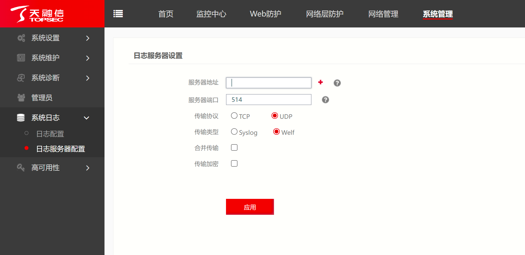 登录WAF后台,通过系统管理-系统日志-日志服务器配置,添加服务器。