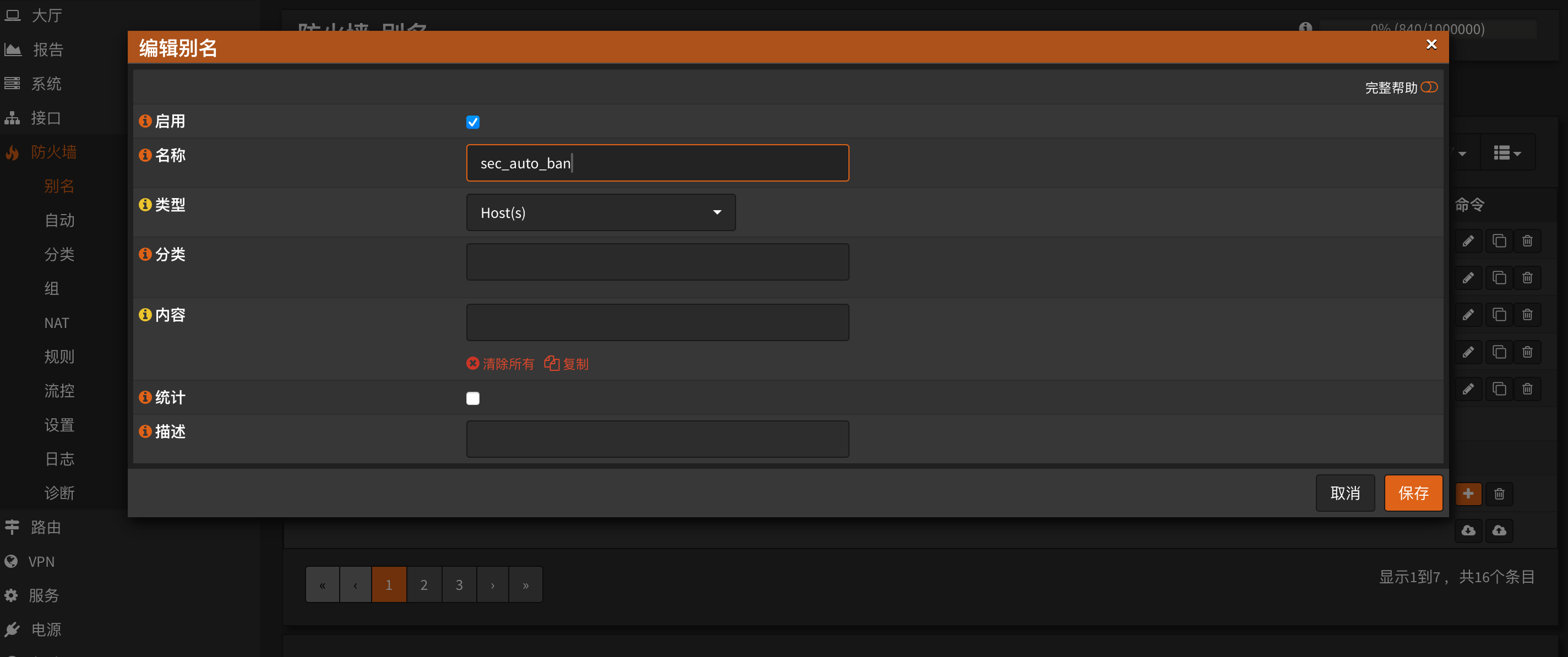 在防火墙-别名页面新建别名sec_auto_ban并保存: