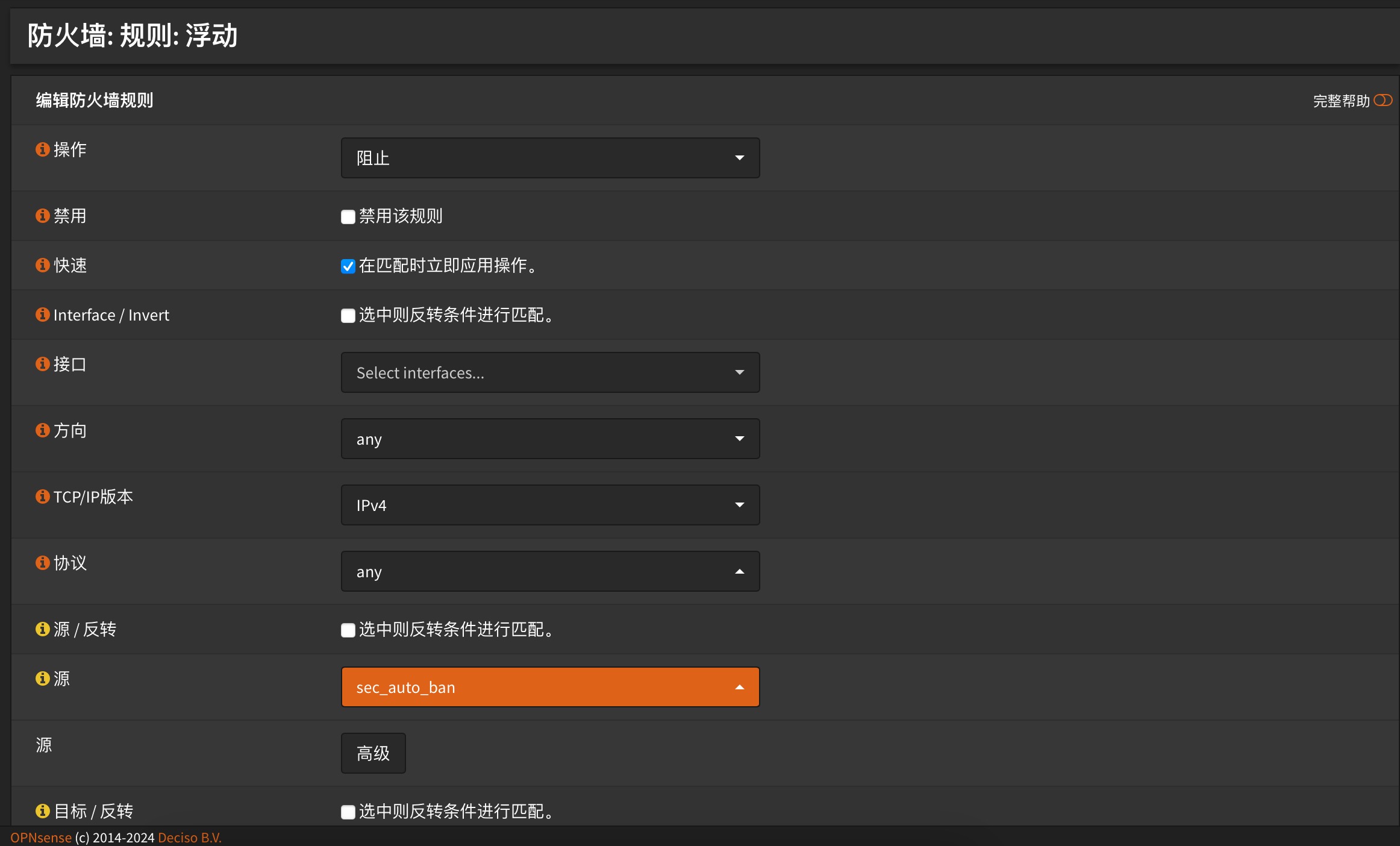 在防火墙-规则-浮动页面新建两条规则,分别为阻止源IP为别名组及目标IP为别名组,图例: