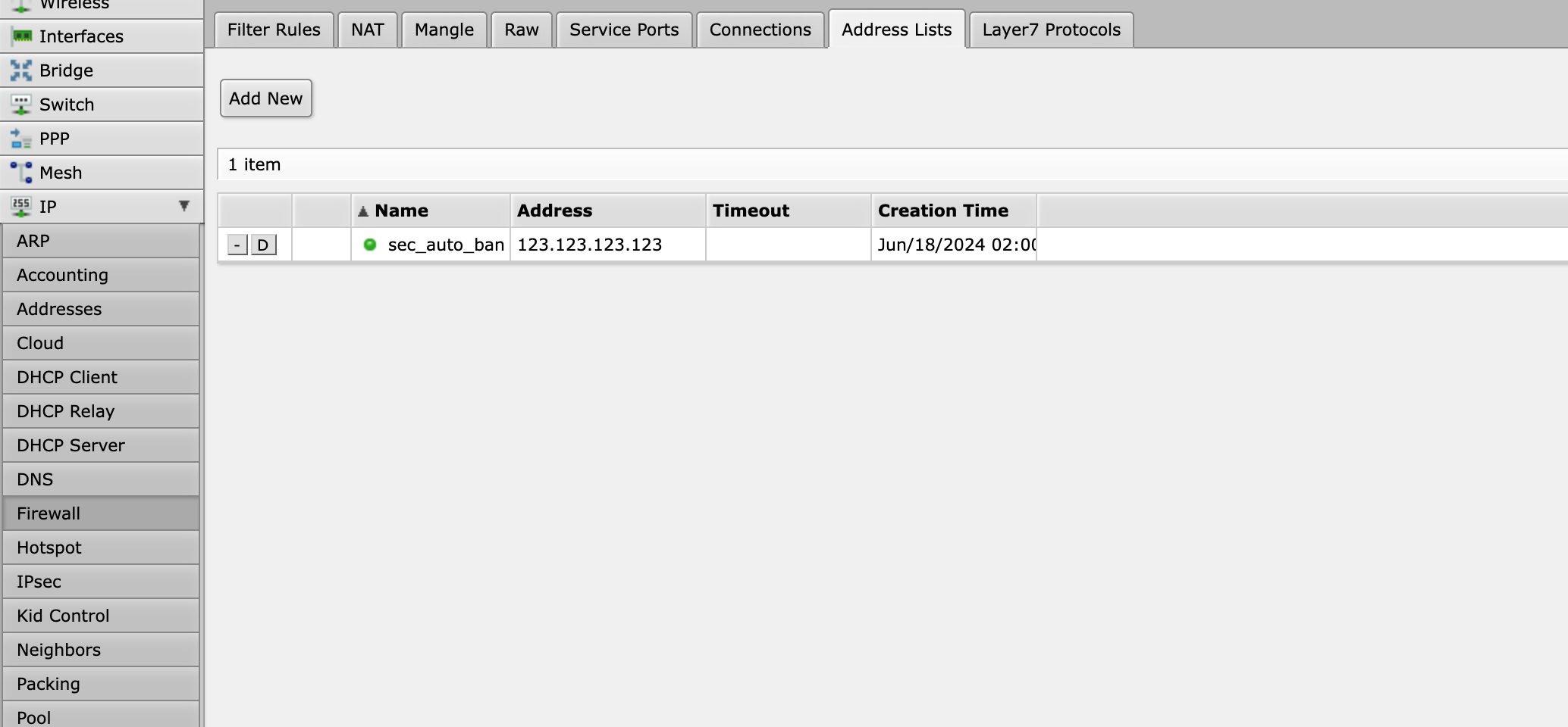 导航至:IP-Firewall-Address Lists。添加一条Address,其中Name为sec_auto_ban,IP填写一个不存在的即可。