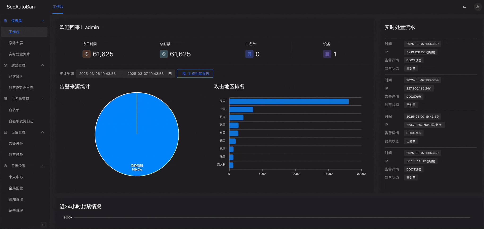 平台支持与多种设备联动进行封禁操作,通过自动化封禁流程,SecAutoBan 能够快速响应安全威胁,有效降低恶意 IP 对网络环境的潜在危害。
