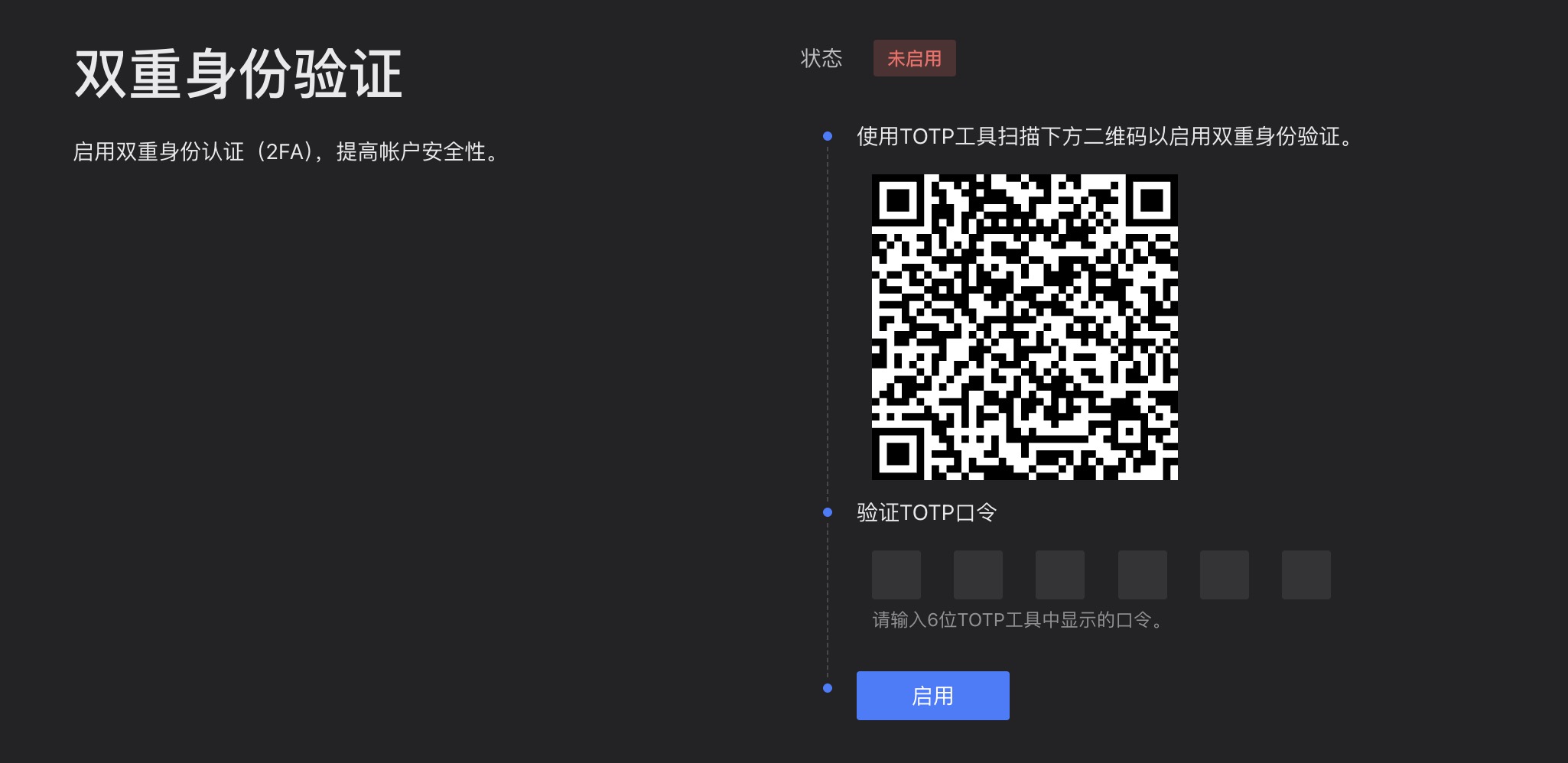 平台导航至设置-个人中心-双重身份验证,使用验证器扫描二维码: